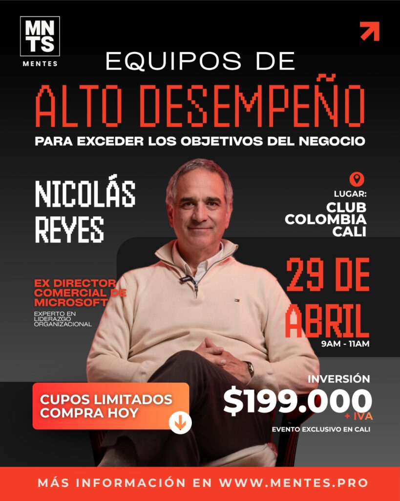 Nicolás Reyes es uno de los conferencistas más reconocidos en liderazgo y desarrollo de equipos de alto desempeño en América Latina. Con más de 25 años de experiencia, ha acompañado a líderes, empresarios y organizaciones a fortalecer su capacidad de ejecución y mejorar resultados en contextos exigentes.